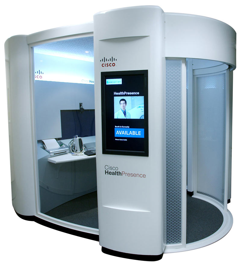 This is “HealthPresence Pod” by Cisco Systems. You see a dotor on the window. Patients can saw a doctor without visiting hospital from everywhere they can use it.