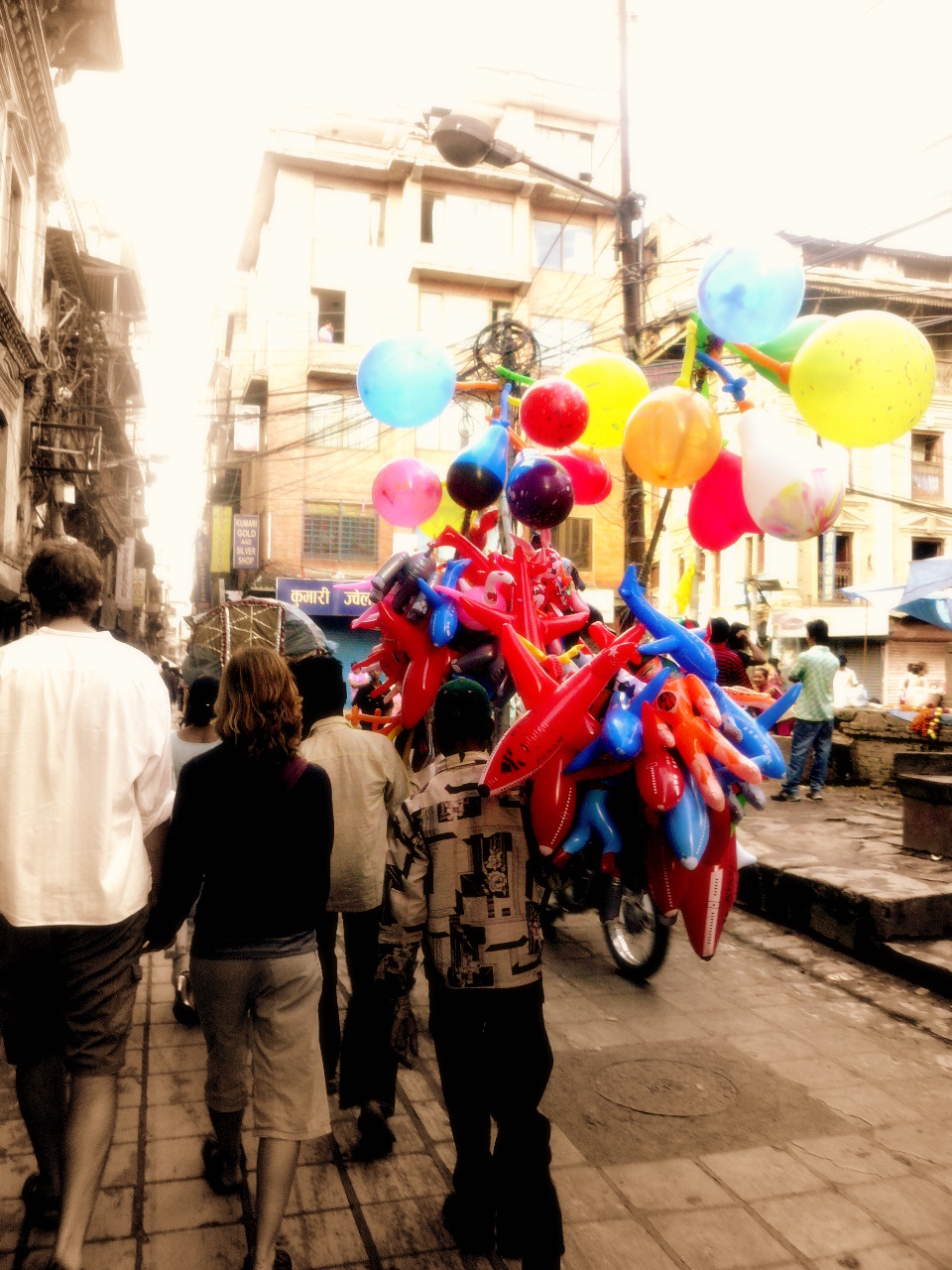 I had never guessed that I saw balloon in Nepal. One day, after the raining, I was walking on the road in Tamel area. A lot of tourists were walking. Then I found a man who had many balloon in his hands. I was walking behind him for a few minutes but nobody bought balloon from him. Yes, no one bought it but those balloons made the view of the street light and children had a smile when they passed the man on the street. I wonder if he noticed that his ruin business makes some happiness.